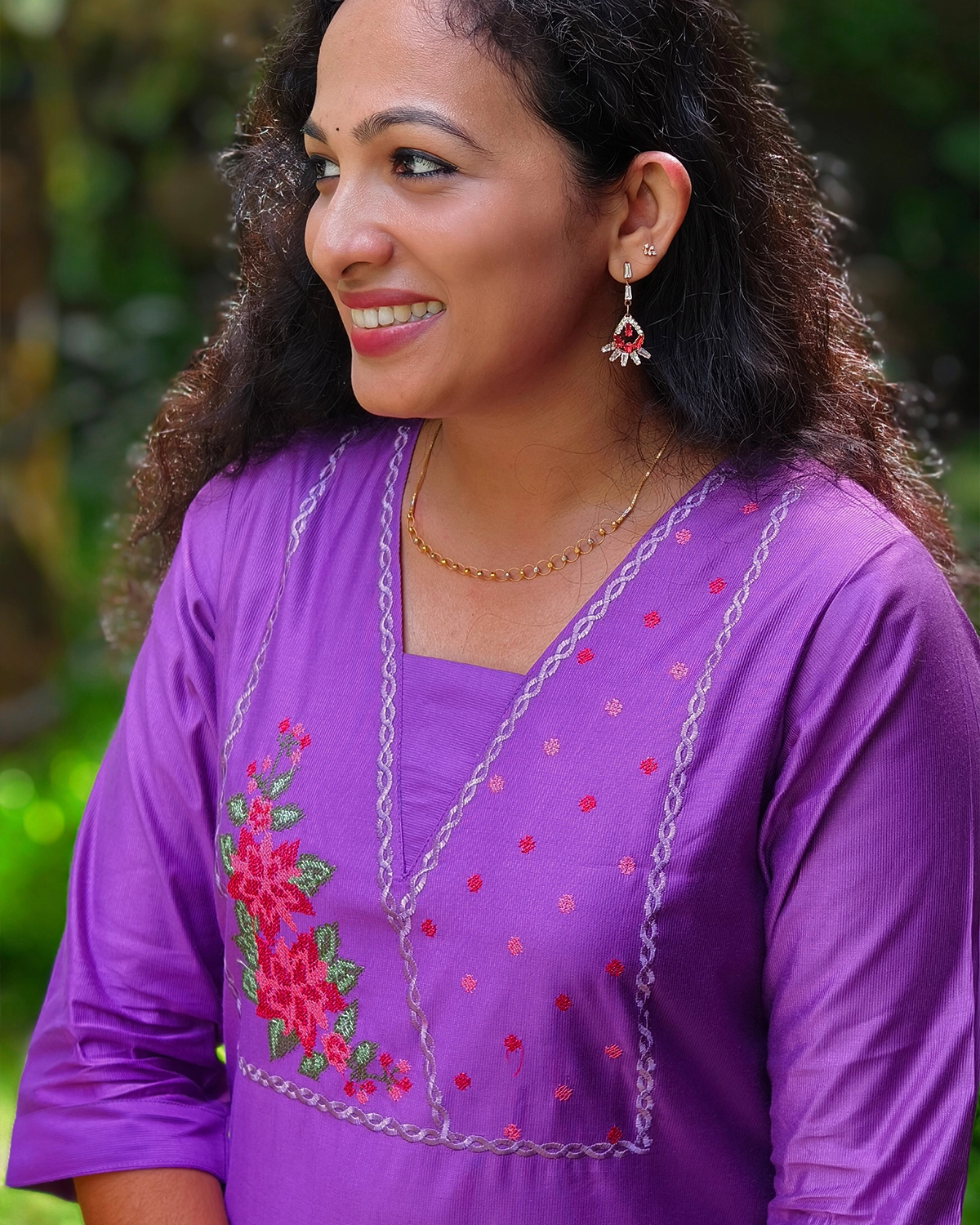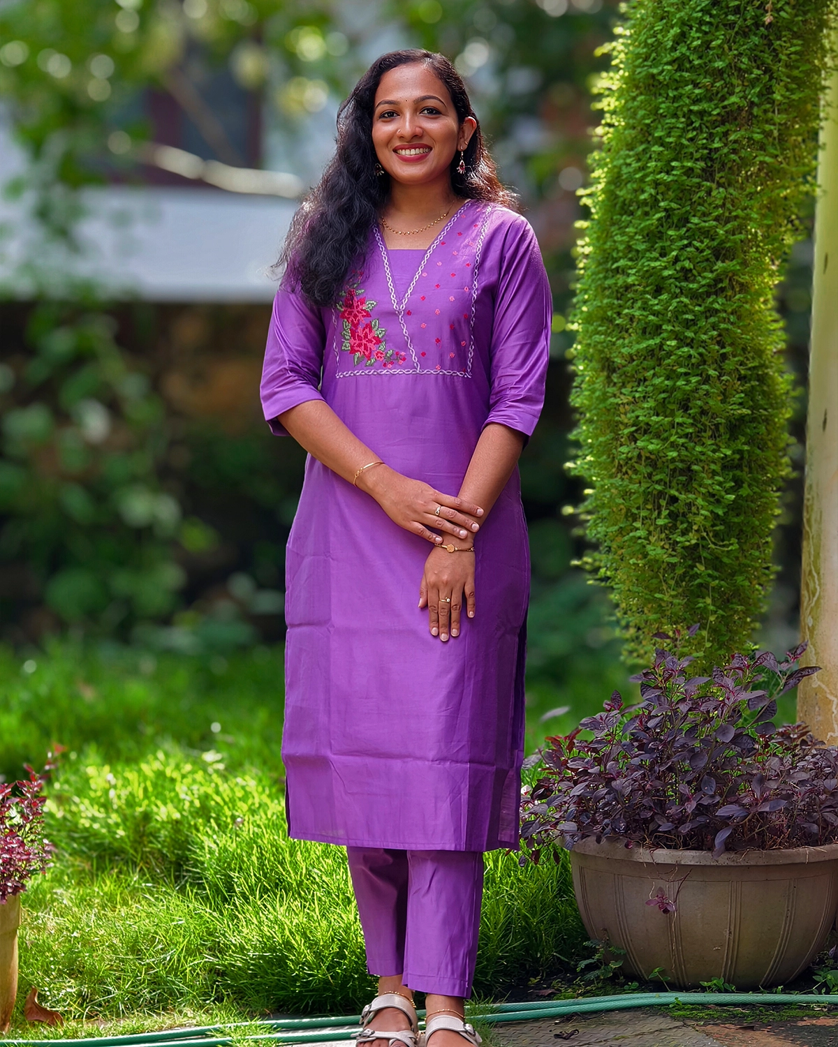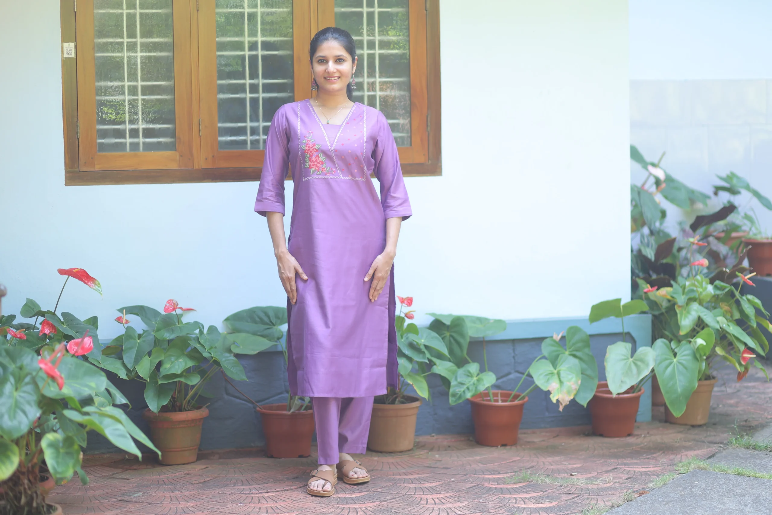 Solid-color coord set featuring delicate floral embroidery on the yoke. Lightweight, breathable, and effortlessly stylish—perfect for everyday elegance.