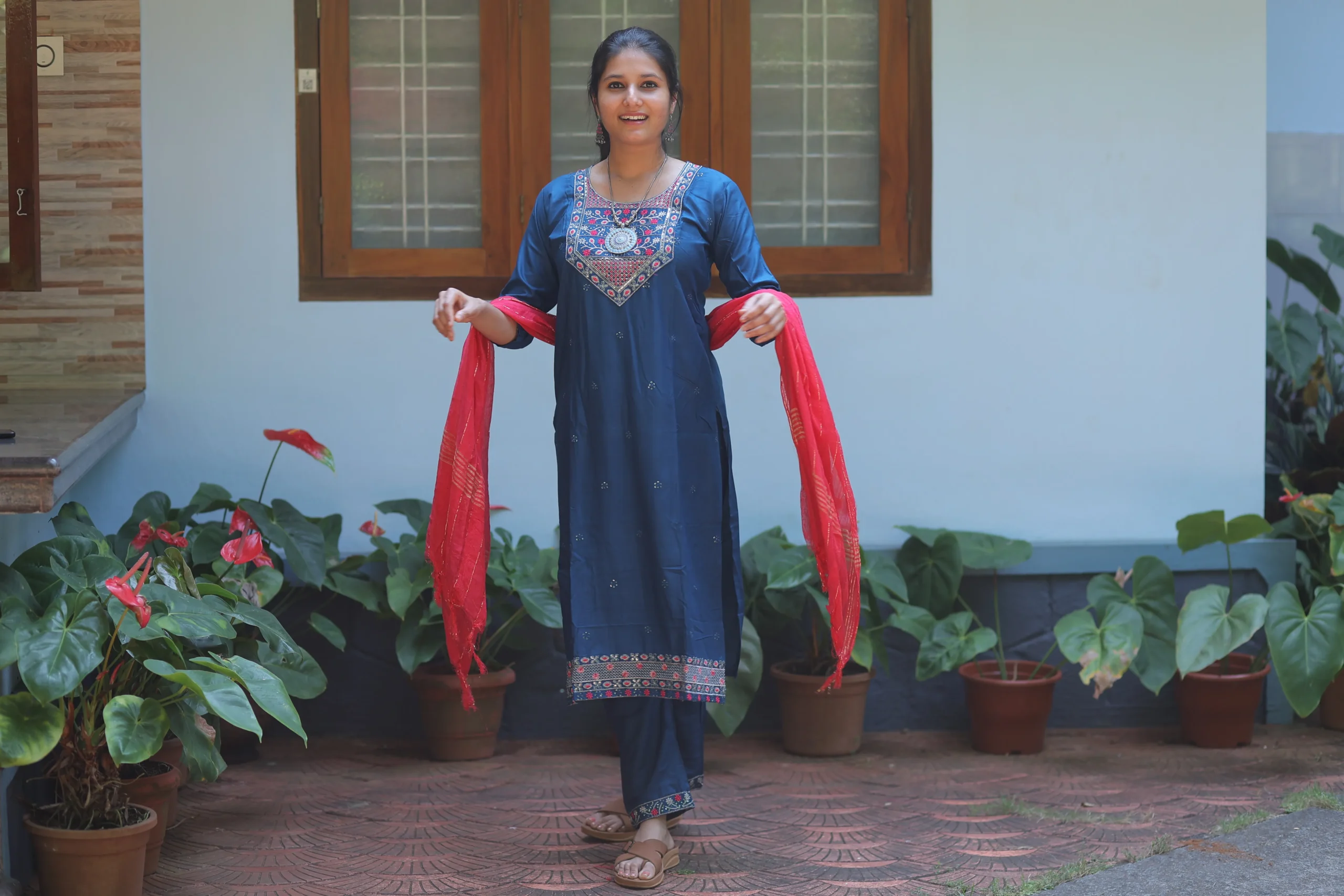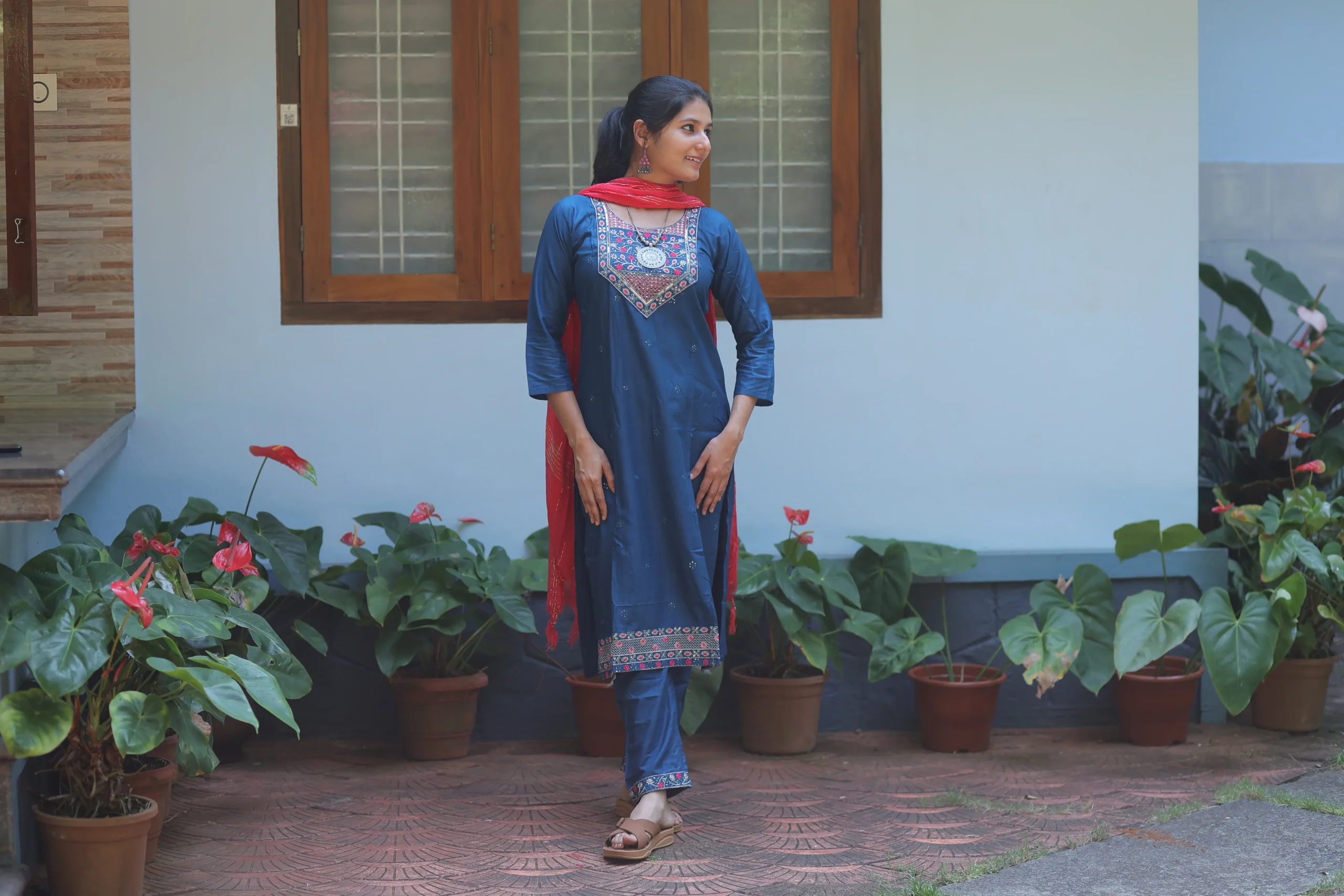 Elevate your ethnic wardrobe with this graceful 3-piece ethnic wear set, thoughtfully designed to blend tradition with contemporary elegance. The set includes a beautifully embroidered top in teal blue colour paired with a comfortable bottom and a contrast pink dupatta, creating a complete and coordinated look.