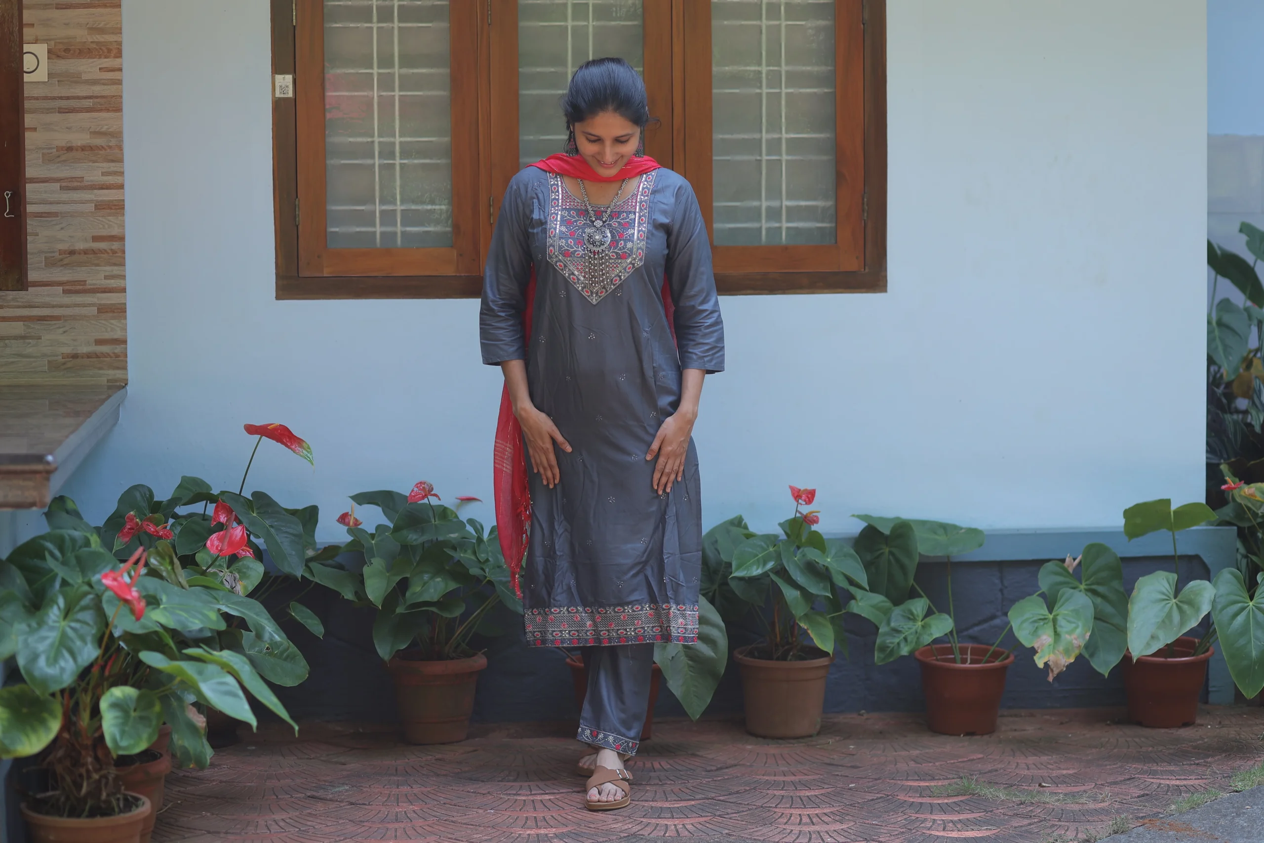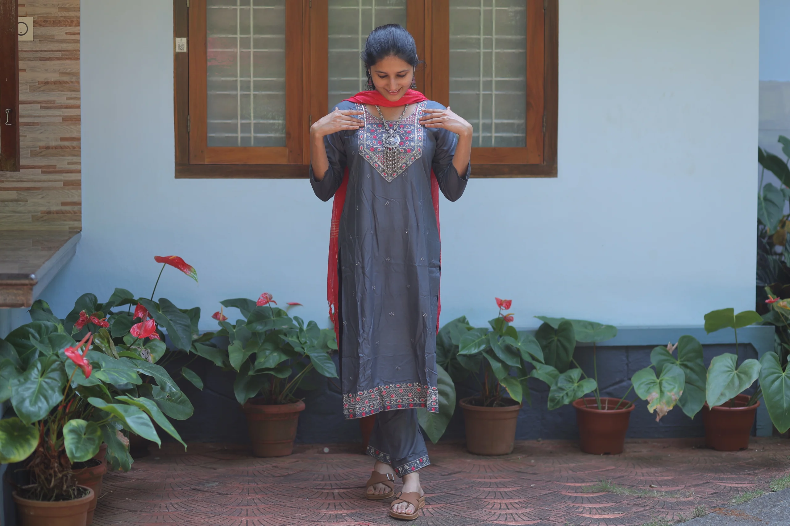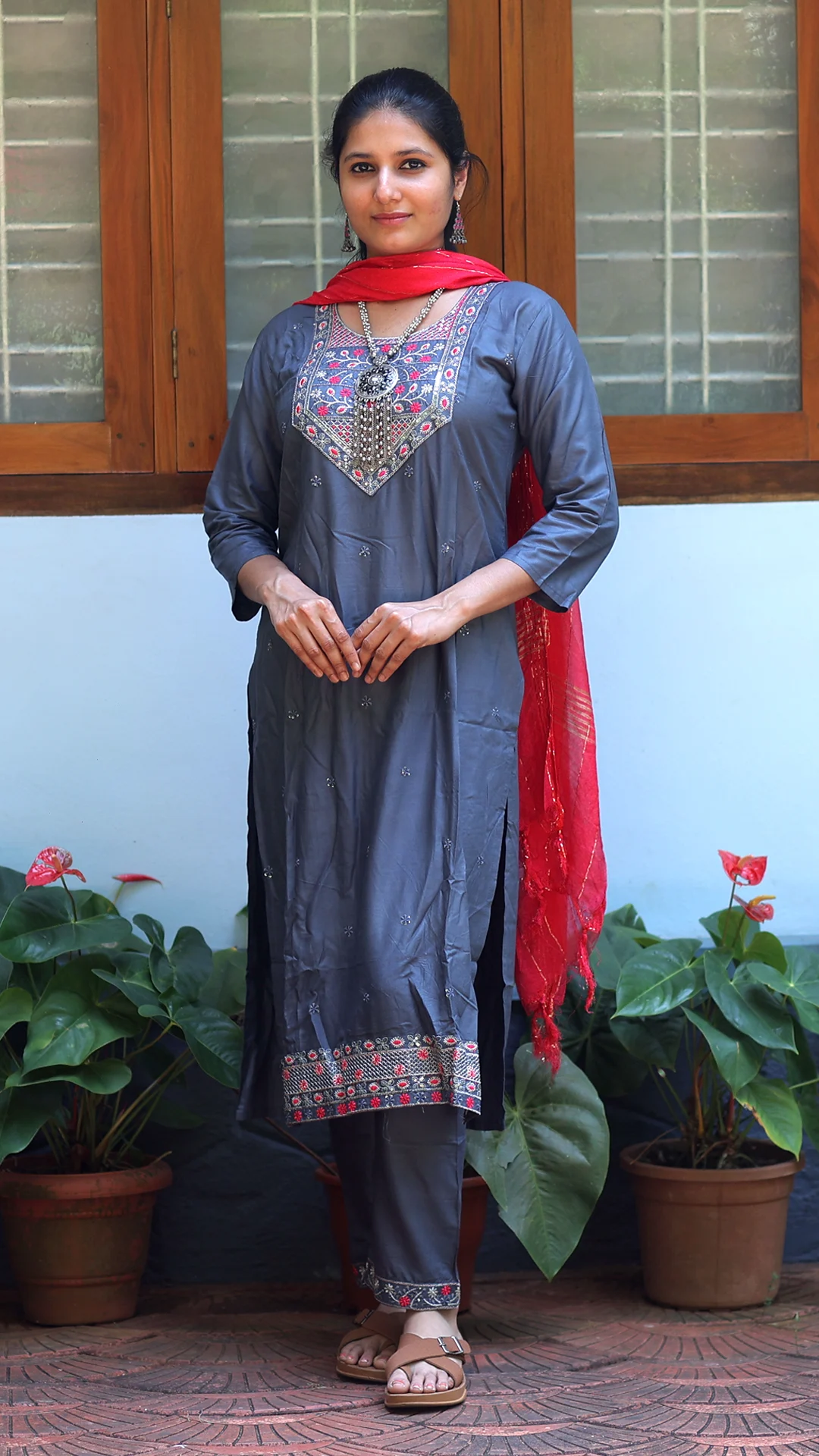Elevate your ethnic wardrobe with this graceful 3-piece ethnic wear set, thoughtfully designed to blend tradition with contemporary elegance. The set includes a beautifully embroidered top in Grey colour paired with a comfortable bottom and a contrast pink dupatta, creating a complete and coordinated look.Perfect for festive occasions, casual celebrations, family gatherings, or everyday ethnic styling, this versatile set offers both comfort and style, making it a must-have addition to your wardrobe.