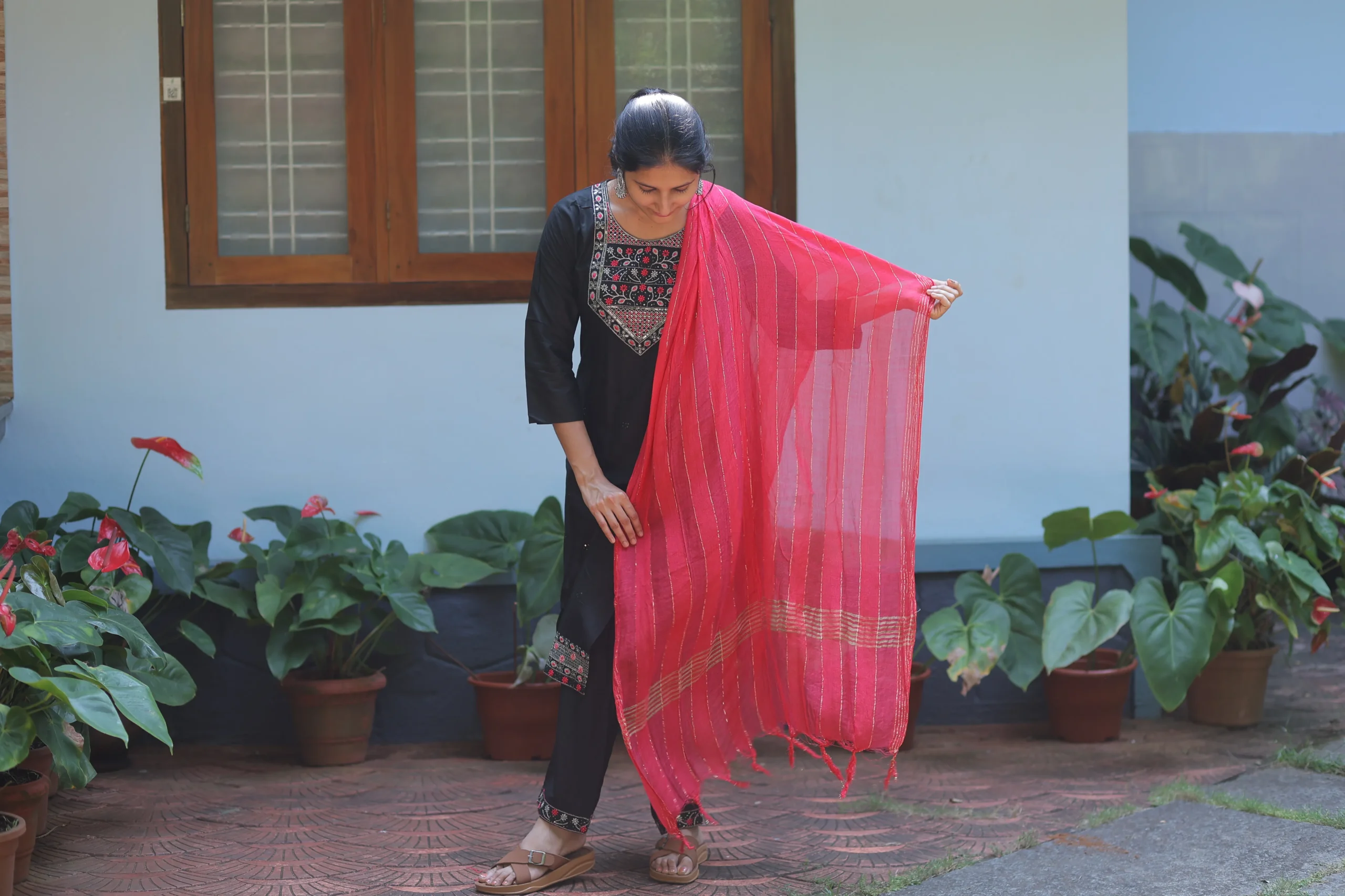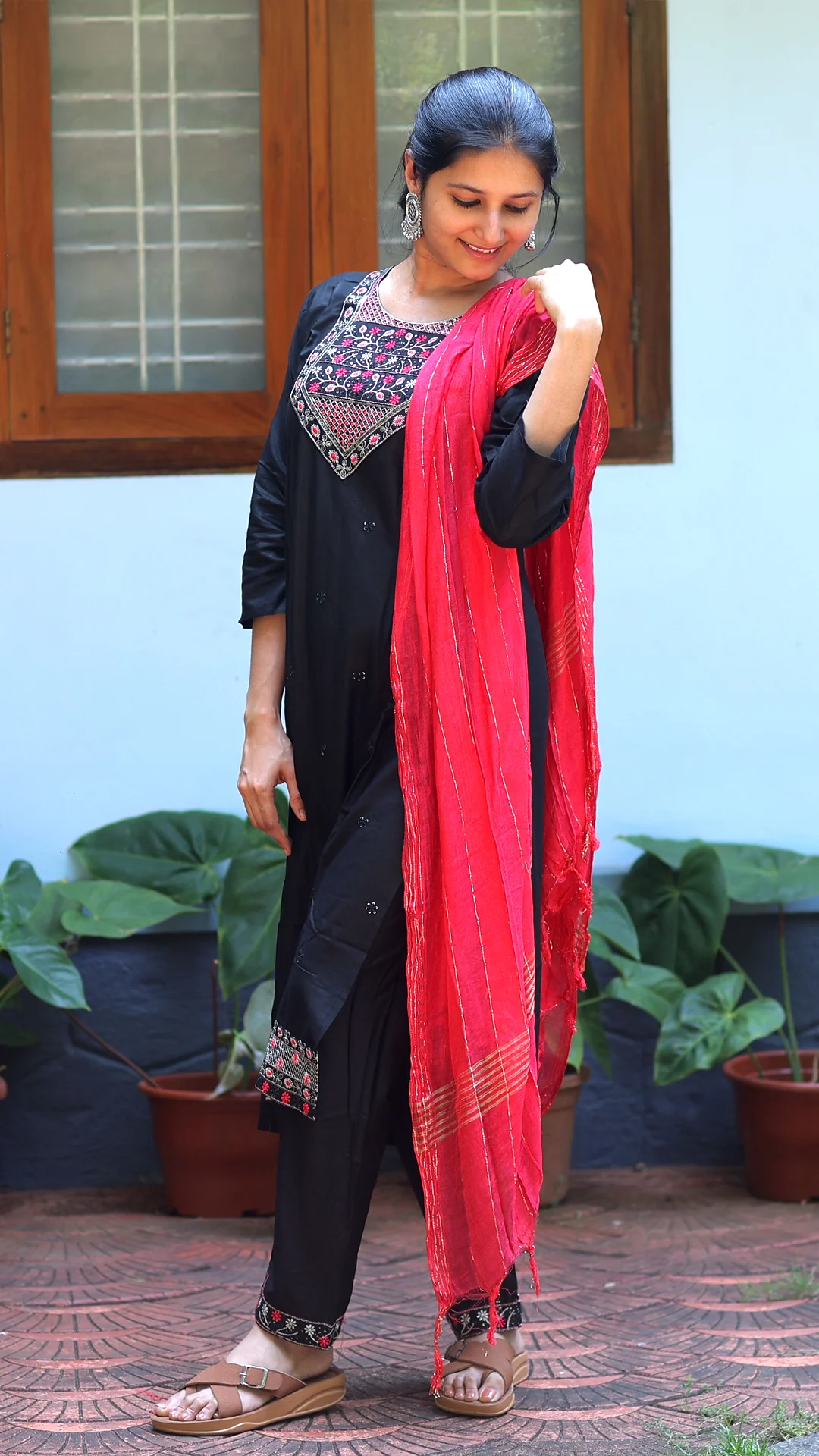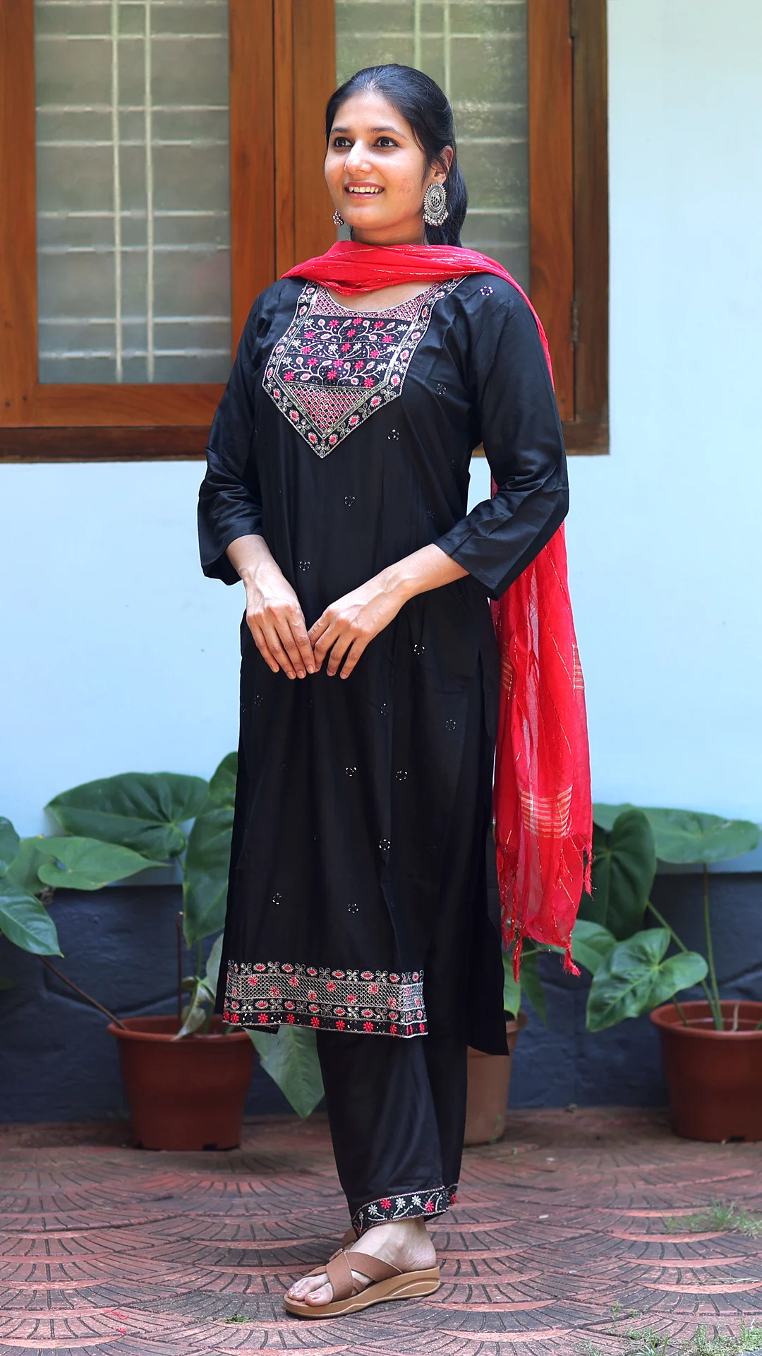 Elevate your ethnic wardrobe with this graceful 3-piece ethnic wear set, thoughtfully designed to blend tradition with contemporary elegance. The set includes a beautifully embroidered black top paired with a comfortable bottom and a matching contrast dupatta, creating a complete and coordinated look.