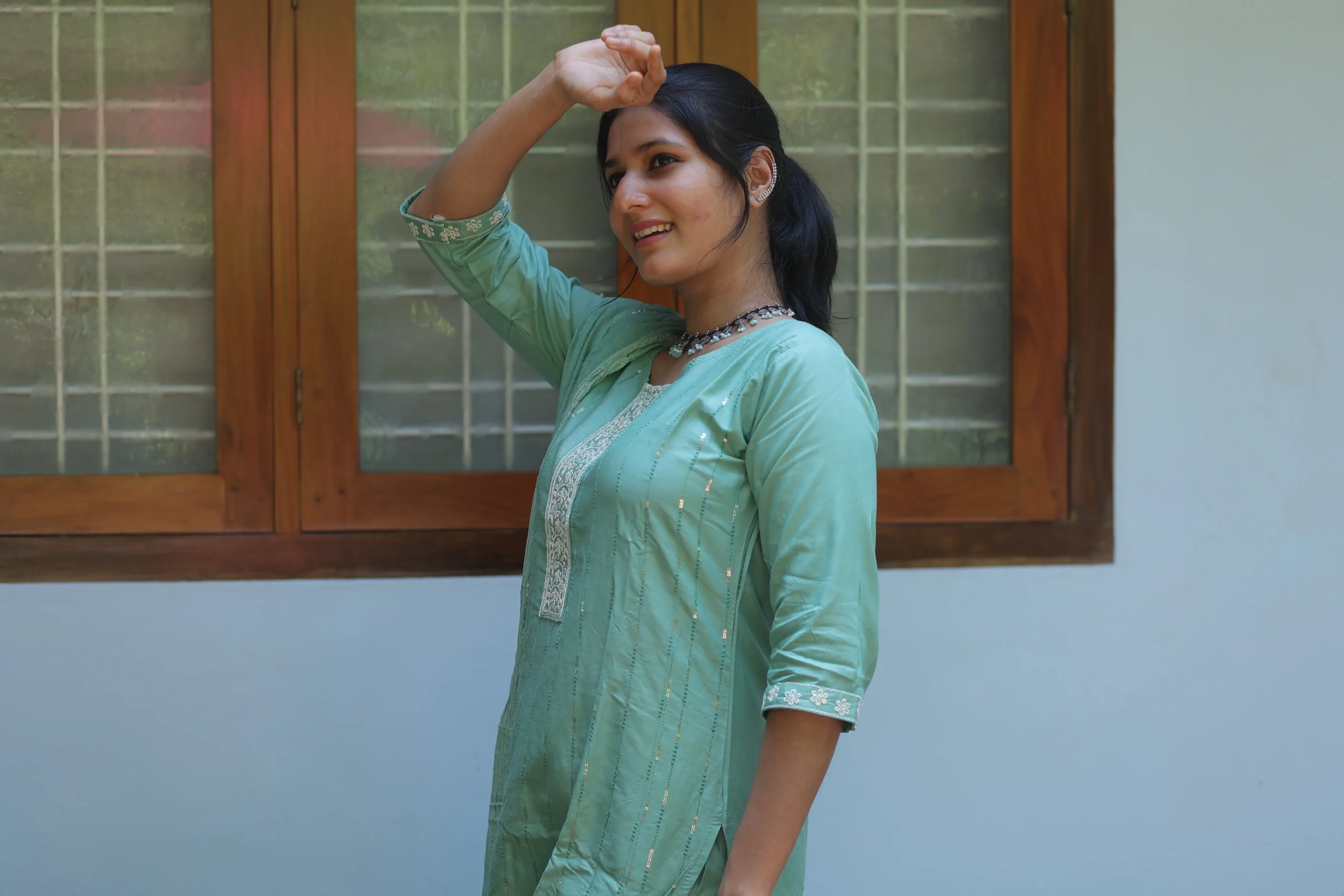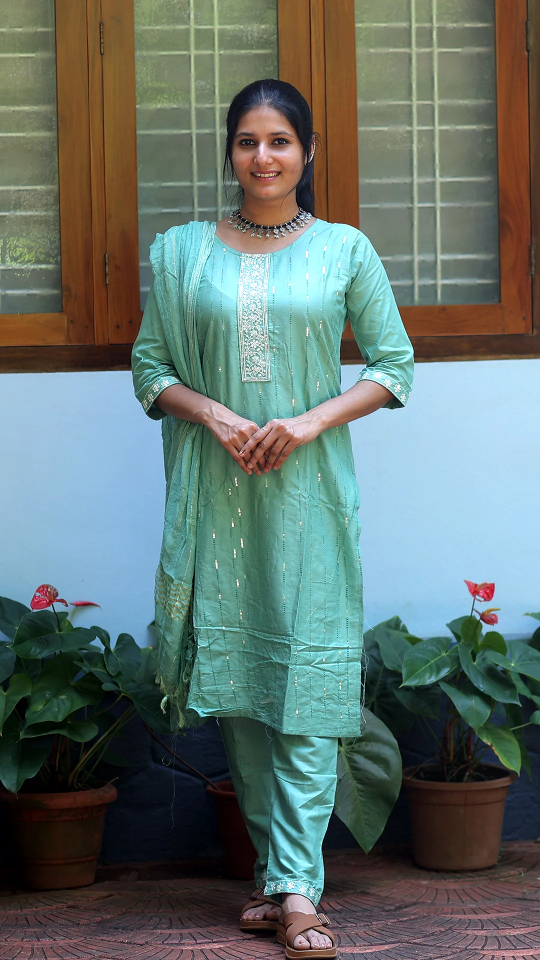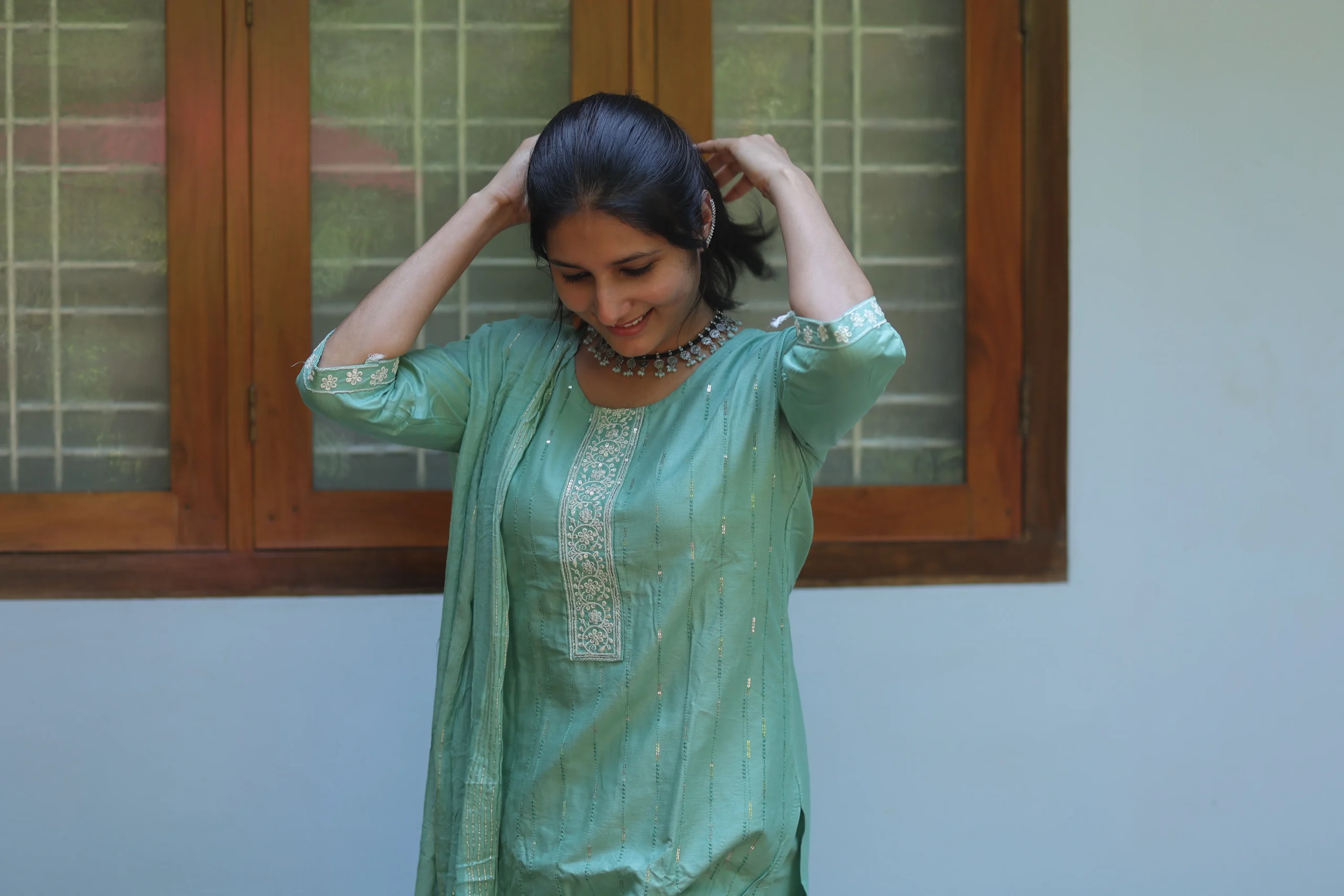 Elevate your wardrobe with this graceful 3-piece ethnic wear set, thoughtfully designed to blend tradition with contemporary elegance. The set comes in a pastel green colour includes a beautifully crafted top paired with a comfortable bottom and a matching dupatta, creating a complete and coordinated look.