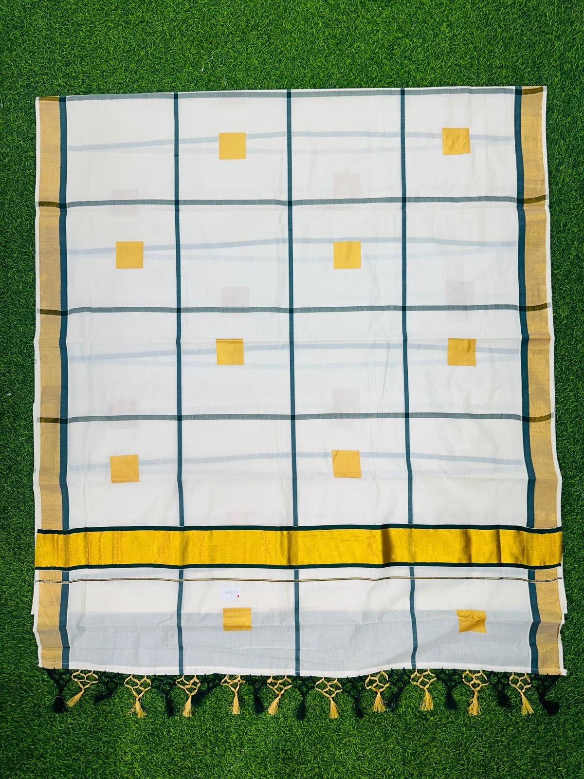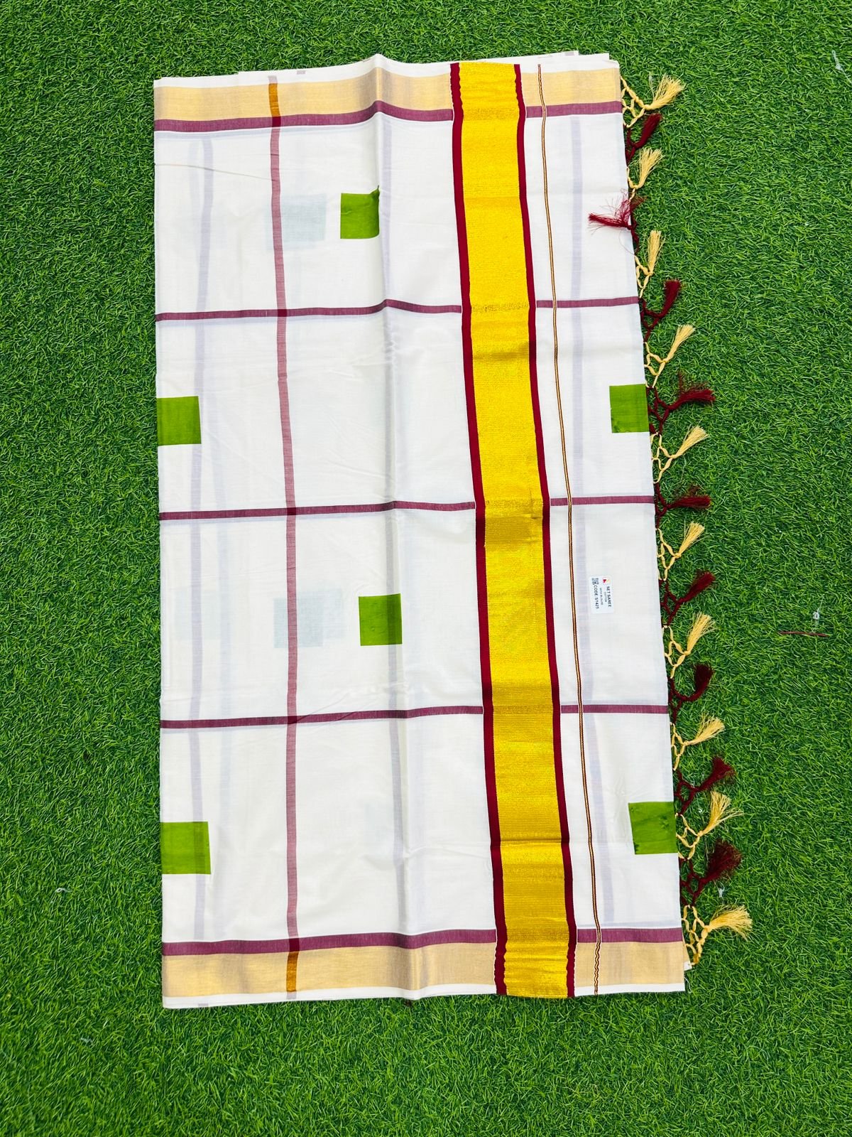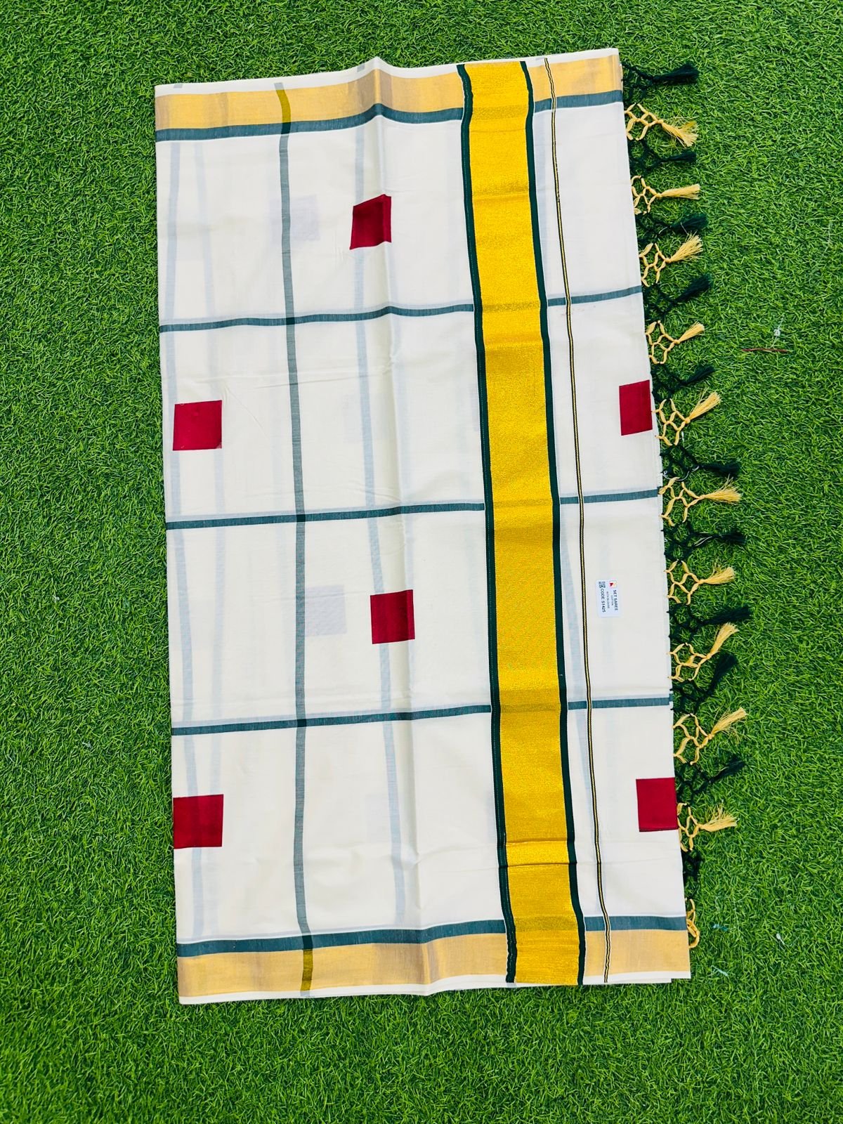 Redefine tradition with our Modern Grid Collection. This Kerala Set Saree features a crisp off-white cotton base structured with a fine grid (check) pattern. Accented with bold geometric block motifs in vibrant shades and finished with handcrafted dual-tone tassels, this saree is designed for the woman who loves a minimalist yet striking look.