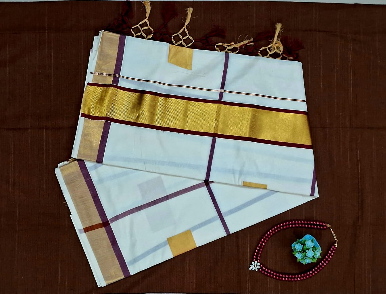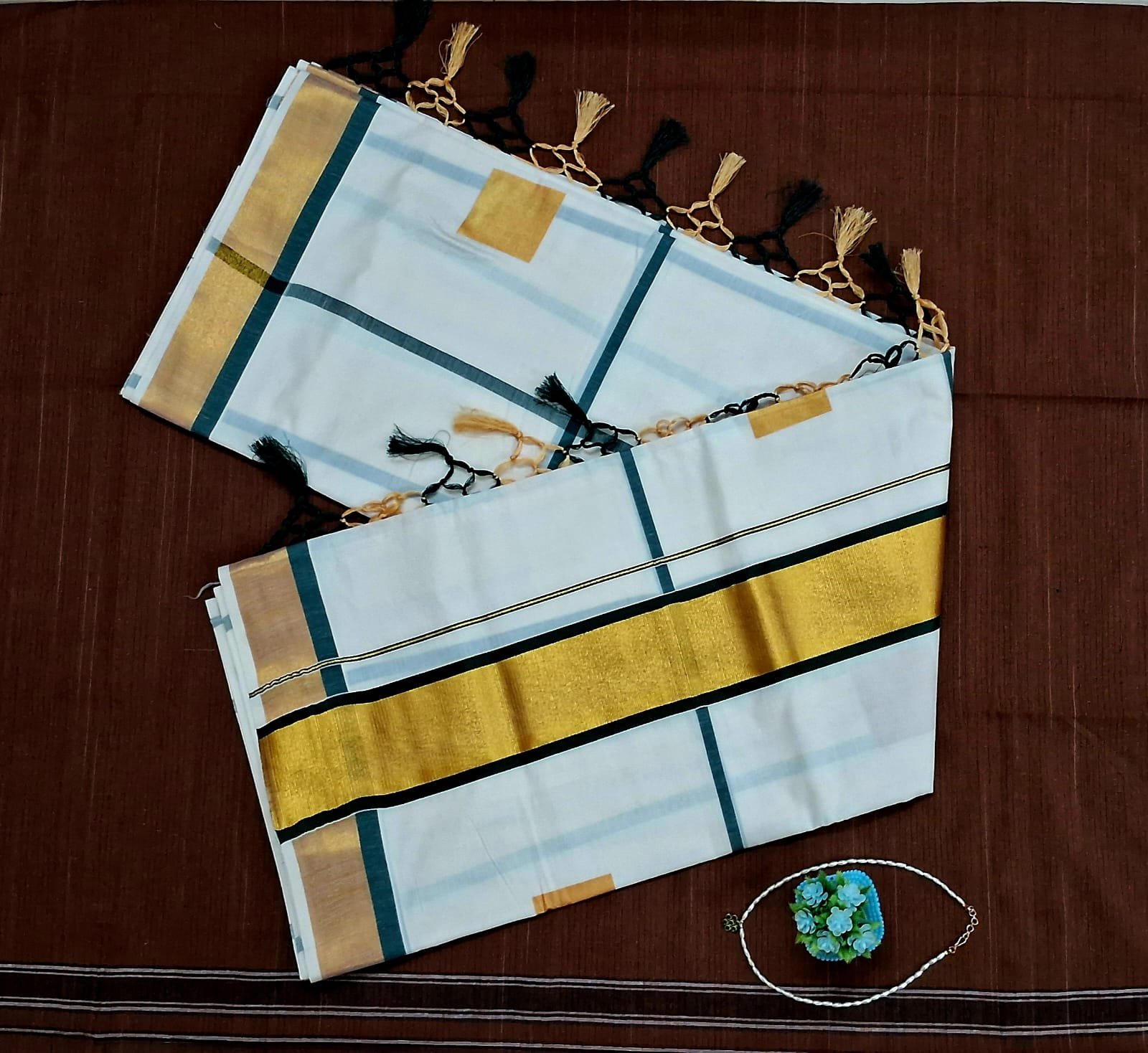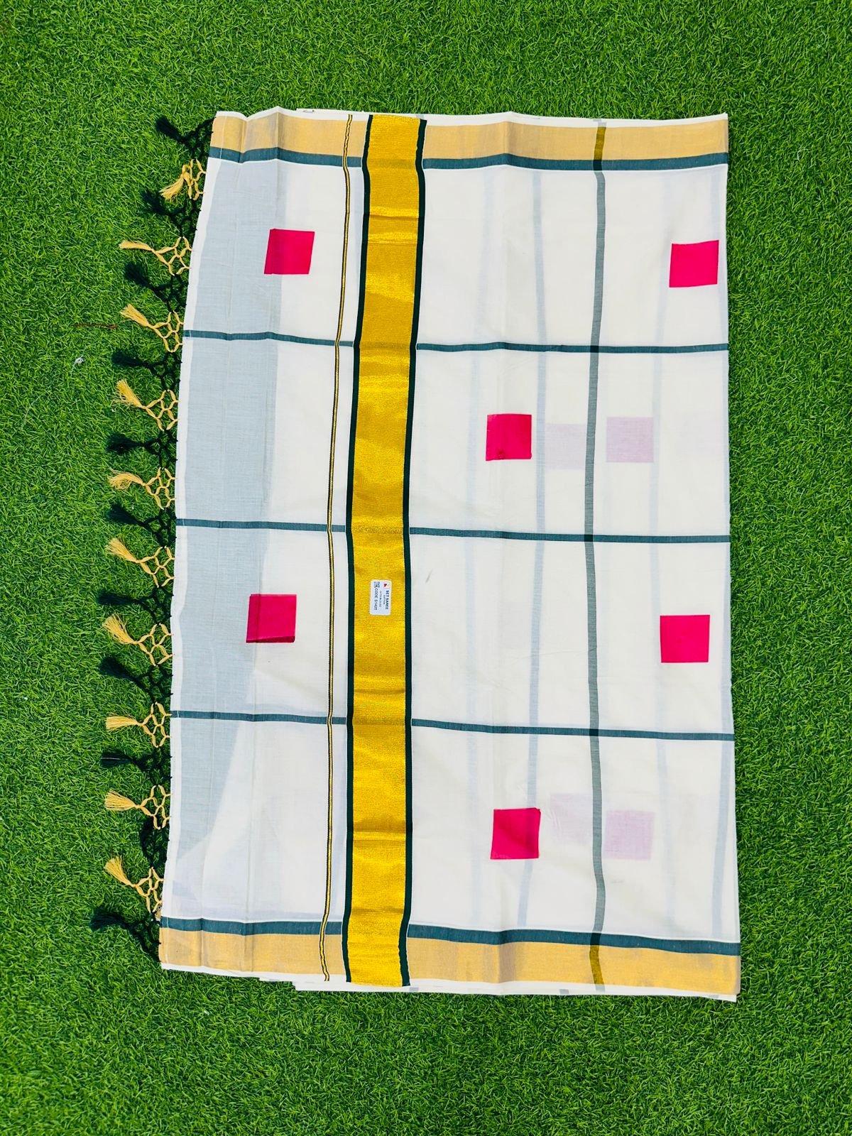 Redefine tradition with our Modern Grid Collection. This Kerala Set Saree features a crisp off-white cotton base structured with a fine grid (check) pattern. Accented with bold geometric block motifs in vibrant shades and finished with handcrafted dual-tone tassels, this saree is designed for the woman who loves a minimalist yet striking look.